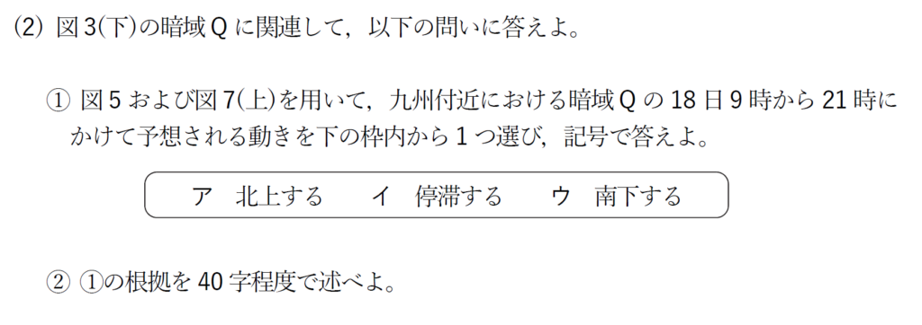 ①暗域Qは問1(4)②より図5の500hPa面の細長い正渦度域のすぐ北側に対応しています。