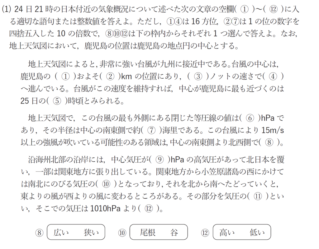 つまり問題文の風速15m/sはおおよそ30ktですので、図の下部の英語で書かれた30kt以上の区域について考えればよいわけです。南東側で210NM、反対(北西)側で150NMとなっているので、北西側のほうが風速15m/s以上の強風域は狭いです。