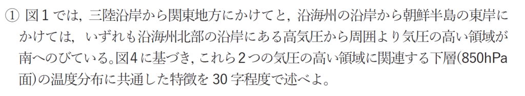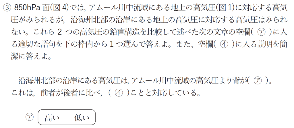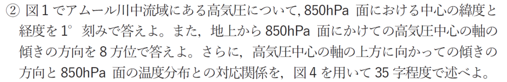 これらをまとめると、高気圧中心の軸は、地上から850hPa面にかけて高温側に傾いている。(34字)