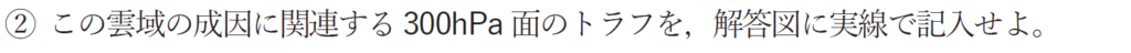 雲域の成因に関連するトラフということですので、トラフは、雲域の西側ということになります。雲域の西側で等高度線の曲率が大きいところを結びます。トラフは強風軸をまたがないので、強風軸(等風速線の尾根)がある北緯29°付近まで伸ばすと以下のようになります。