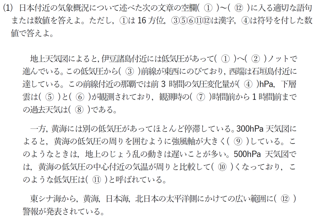 ⑩低気圧中心付近に、温度の極小域であるCがありますので、中心付近の気温はいです。