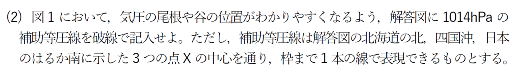 ここで、の間にはが1本入り、、もしくはとなる部分の間には、が0本か2本となるようにの線(1014hPa)を引いていきます。例えば、日本のはるか南の✕と四国沖の✕を南北に直接つなげたくなりますが、停滞前線の東西の1012hPaの等圧線を1本の1014hPaの等圧線で分断することはできません。一方で、関東の南の低気圧の東側の1012hPa1016hPaの等圧線の間には必ず1本の1014hPaの等圧線が必要なので、低気圧の東側を回り込んで日本のはるか南の✕と四国沖の✕がつながる形になります。これらをまとめると下記のようになります。