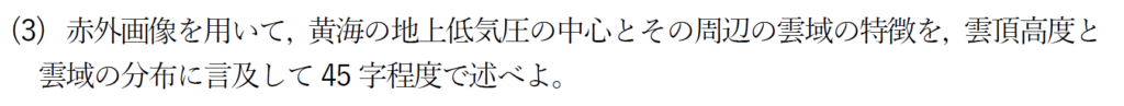 地上低気圧の中心付近では雲頂高度が低く、中心の東側では雲頂の高い雲が南北に連なって(並んで)いる。(44字)