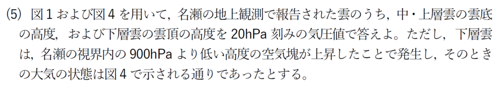 次に下層雲の雲頂高度です。問題文によると900hPaより低い空気塊が上昇したことにより発生したものとしているので、先程のように湿数をもとに判断するのではなく、実際に空気塊を持ち上げるシミュレーションをする必要があります。900hPaより低い空気塊はほぼ湿数0となっており、飽和していますので持ち上げていくと赤で示した湿潤断熱線に沿って温度が低下していきます。最下層から700hPaまでは湿潤断熱線で低下する空気塊の温度のほうが周囲の気温より高いことがわかります。よって空気塊は自由に上昇していきます。しかし700hPaに到達すると周囲の気温の方が空気塊の気温より高くなるため、空気塊は700hPaより上には上昇できなくなります。よって700hPaが雲頂高度となります。