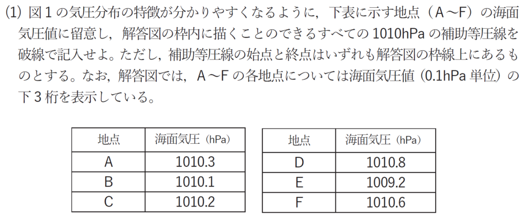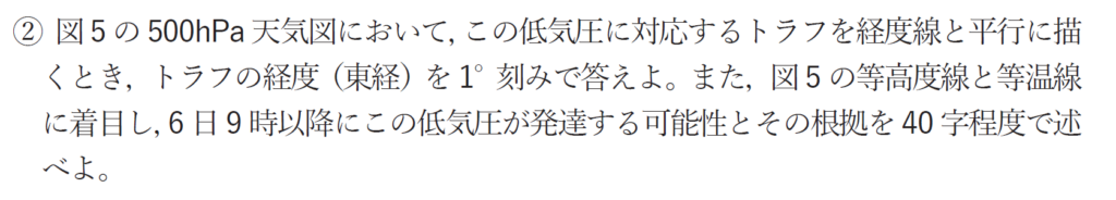 次に等高度線と等温線に注目して、低気圧が発達するかを答えよとのことです。先ほど等高度線からトラフを解析したので、トラフと等温線に着目します。低気圧の中心からみてトラフが西側にあるため、発達するように思えます。