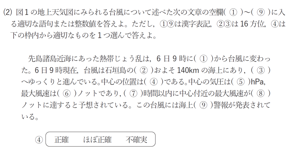 ④FAIRはほぼ正確という意味です。台風の中心の位置の制度はGOOD(正確)、FAIR(ほぼ正確)、POOR(不確実)で表されます。それぞれの中心位置の確度は30海里以内、30海里超で60海里以内、60海里超となっています。