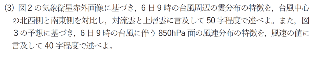 まず、赤外画像における台風中心付近の雲分布についてですが、中心付近の雲域は非常に白く団塊状に写っているため、発達した積乱雲であることがわかります。このあたりの雲分布を問題文の指示通りに中心の北西側と南東側を比較してみますと、北西側は雲が少なく、南東側は雲頂高度の高い雲が多く広がっているのがわかります。