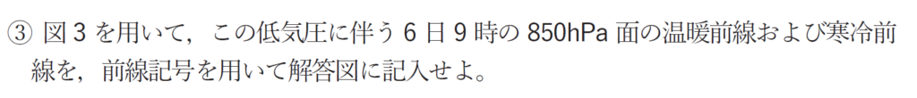 ③暖前線と寒冷前線を記載するように求められていることや、①で強風軸が低気圧中心の真上にあったことから、今回の前線は閉塞していないようです。