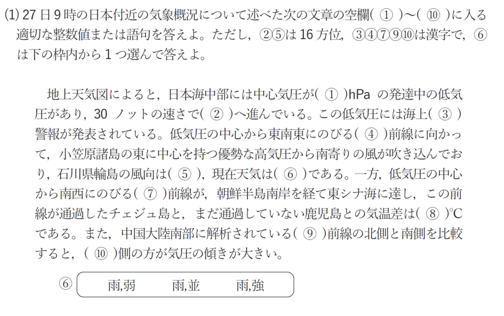 ③GWは海上強風警報です。海上強風などと書くと間違いですので、どの部分が()になっているかよく読みましょう。