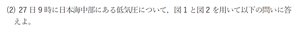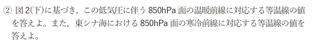 前線に対応する等温線を答える問題です。①の図2下を見ると、温暖前線は9℃、寒冷前線は12℃の等温線付近に位置しています。