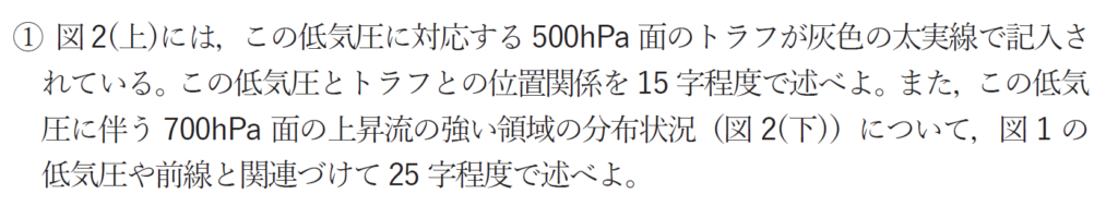 低気圧とトラフの位置関係についてです。図2上に地上低気圧中心を落とし込むと、上のようになります。この位置関係について、そのまま記載するとよいでしょう。