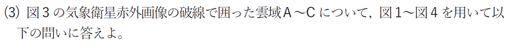 次に雲域Bと寒冷前線の位置関係と連なる方向についてです。雲域Bは青で示した寒冷前線の南東側に位置し、寒冷前線と平行な方向に連なっています。よって