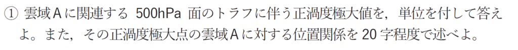 まず雲域Aは図2の赤で囲った部分になります。正渦度極大点として+219と書かれていますので、正渦度極大値を単位をつけて答えると、219×10-6/sとなります。また、この極大点は雲域Aの最も西側にありますので、位置関係については、