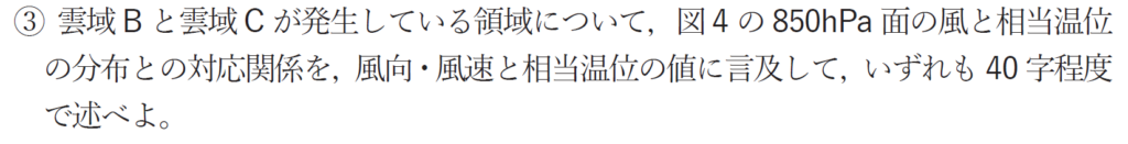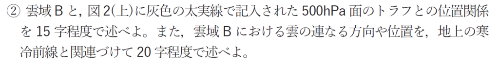 (雲域Bは)寒冷前線の南東側に平行にのびている。(18字)