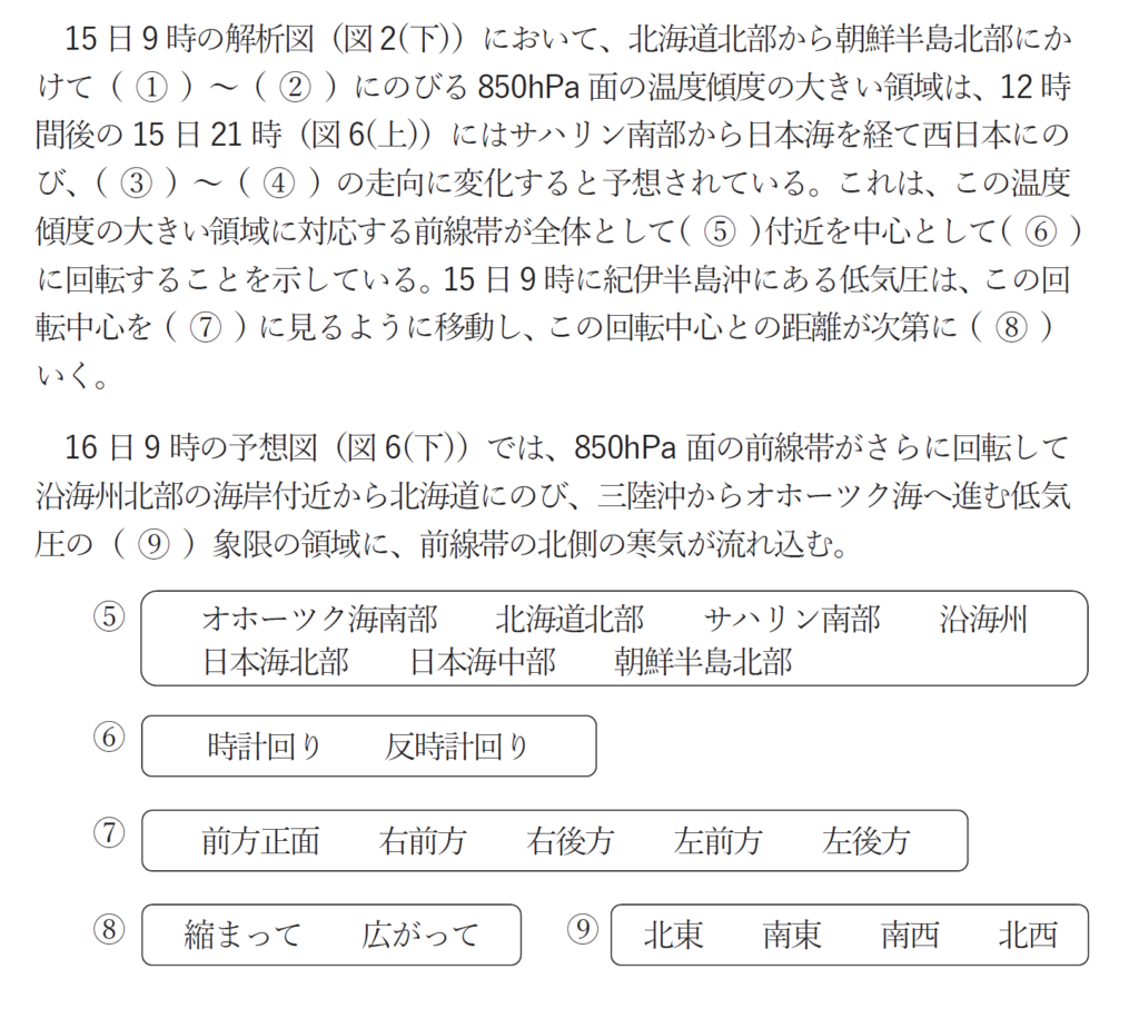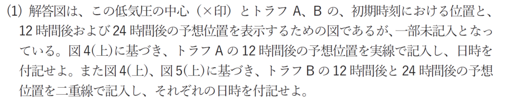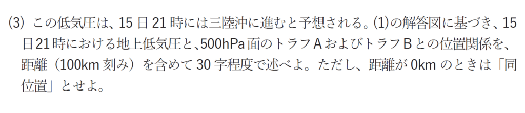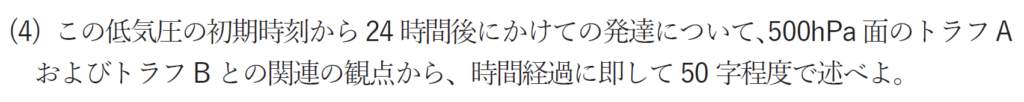低気圧の発達とトラフの関係といえば、低気圧の西側にトラフがあるときに、低気圧が発達するという背景があります。これを念頭におき解答を作りましょう。