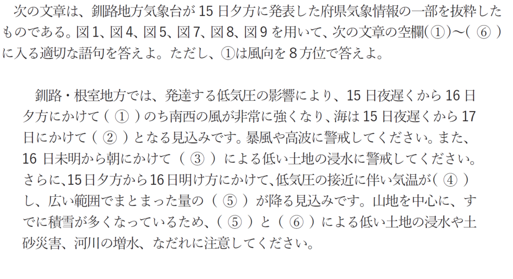 ②15日21時以降低気圧が接近し、16日4時から5時頃に最も接近する予想ですので、前後の文脈に合う言葉で大しけが正解となります。