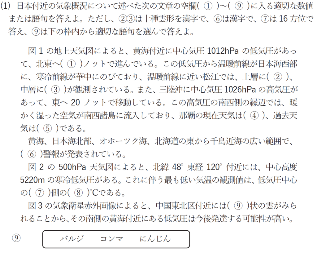 (1)⑨の雲域を緑色で示しています。バルジ状の雲は暖湿空気が前線面を滑昇することでできます。当然空気は湿っていて暖気移流となるのですが、天気図で確認します。