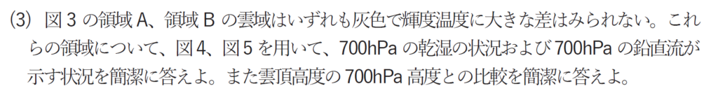 また、領域Aは700hPaにおいて乾燥域であることから、雲頂高度は700hPaより低い。領域Bは湿潤域であることから雲頂高度は700hPaより高いといえます。