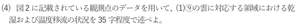 雲に対応した領域は湿数3℃以下の地点が多く湿潤で、暖気移流の場である。(35字)