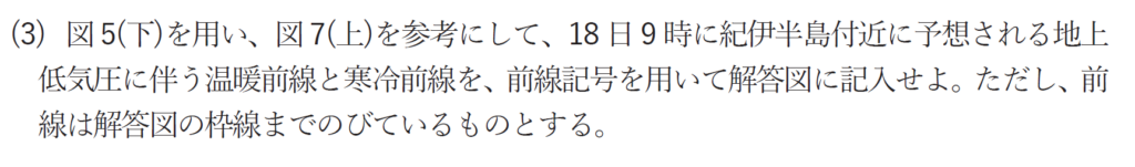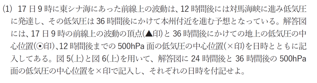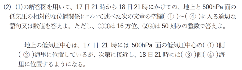 ②地上低気圧中心と500hPa低気圧の中心の地図上の距離は20mmであり、北緯30°から40°の地図上の距離40mmの半分です。北緯30°から40°の実際の距離は600海里なので、地上低気圧中心と500hPa低気圧の実際の距離は300海里です。