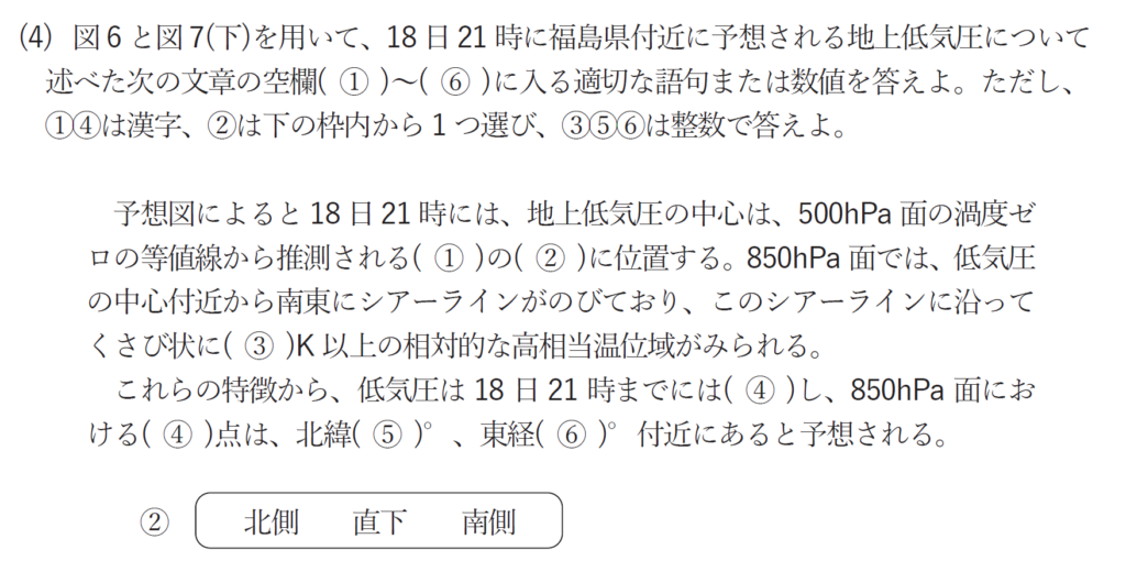 ⑤閉塞前線は強風軸の真下付近に形成されるのが教科書的パターンですので、500hPaの天気図から写し取った強風軸と、等相当温位線集中帯がくさび形に入り込んでいる交点付近となりますので、北緯35°、東経143°付近が閉塞点となります。
