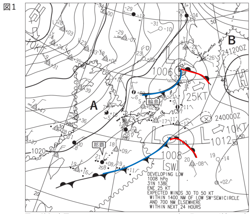 図1の低気圧の前線を図2にトレースすると下記のようになります。