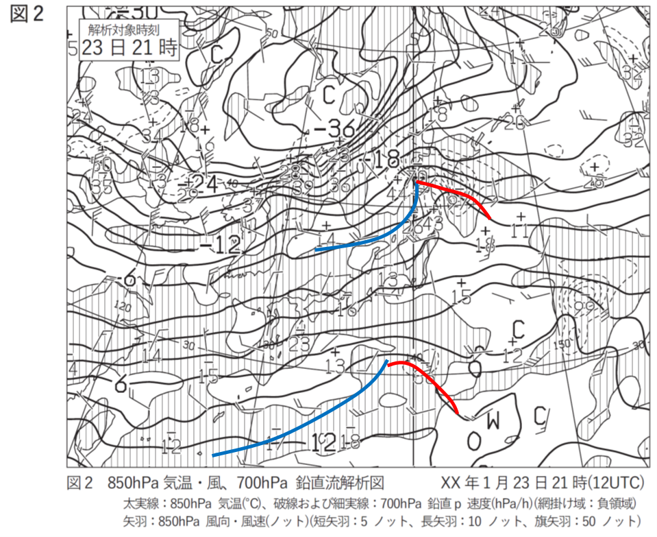 渡島半島付近の低気圧では温暖前線も寒冷前線も中心付近では、前線の傾きも考慮すると850hPa面では-9℃の等圧線に沿っていると言えます。