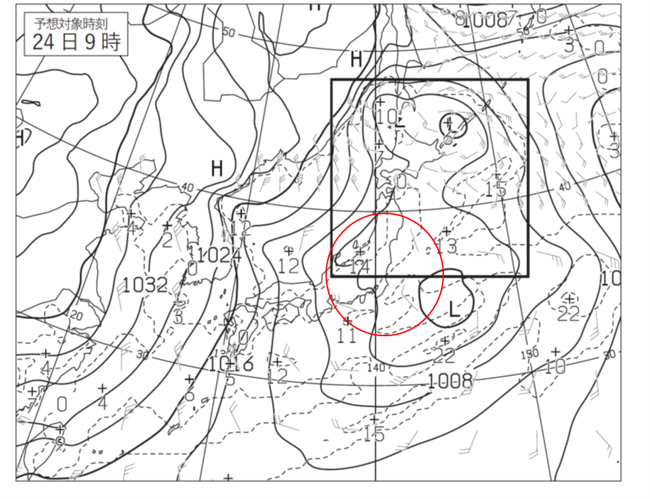 24日9時と21時の水戸から約200kmの範囲を示しました。水戸市の降水量と風速についてはこの範囲の最大値を用いることになっているため、降水量は12時間で最大35mm、風速は最大35ノットとなります。また問題文に、24日21時までの6時間で7cmの降雪となっていますので、この降水は雨ではなく雪となります。7cmの降水と35ノットの風速はどちらも注意報レベルなので、大雪注意報や強風注意報、風雪注意報の可能性があります。