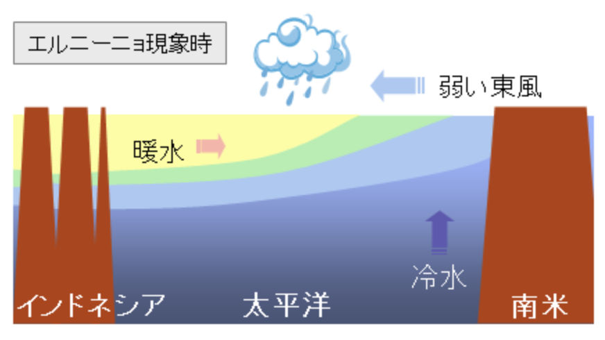 - 西側に溜まっていた暖かい水が東側(南米ペルー沖)へ広がります。