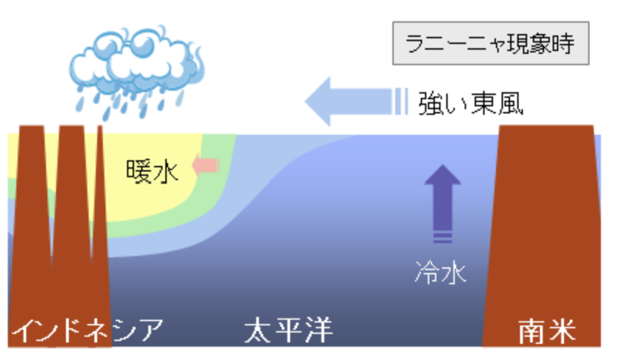 - メカニズム: 貿易風が強まることで発生します(エルニーニョの逆)。