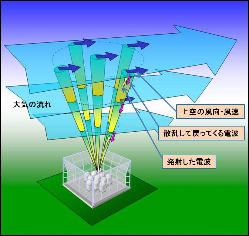 上空の風(3次元ベクトル)を決定するために、上空に向けて5方向のビームを切り替えて発射します。