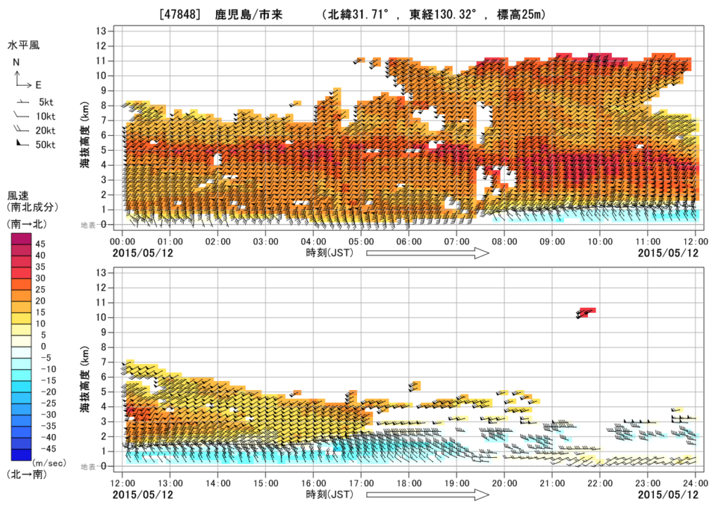 - 図上では、風向の変化するライン(前線面)が、時間とともに下がってくるように見えます(温暖前線の境界面が緩やかで、上空から先に暖気が入ってくるため)。