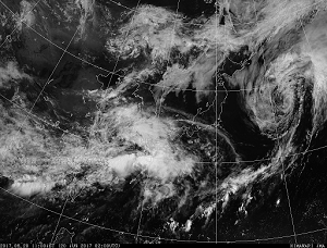 • 白く映るもの: 温度が低いもの(=高度が高い雲、背の高い積乱雲)。