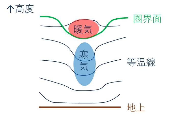 中心付近では非常に冷たく重い空気が存在するため、対流圏と成層圏の境界である「圏界面」が、漏斗(ろうと)のように下に向かって大きく引きずり込まれています。 これにより、上空の中心付近には成層圏の空気が入り込んでいます。成層圏は上空ほど気温が高い構造なので、成層圏の空気が沈降している寒冷低気圧上層は周囲より気温が高いことになります。