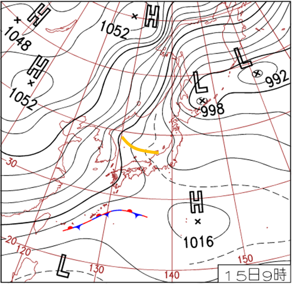 | 気圧配置 | 等圧線がくの字に曲がる | 等圧線が縦にならぶ |