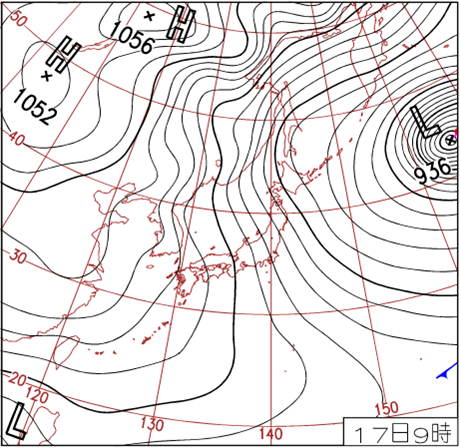- 等圧線の特徴: 日本付近で等圧線が南北に何本も走り(縦縞模様)、その間隔が狭くなるほど風が強まります。