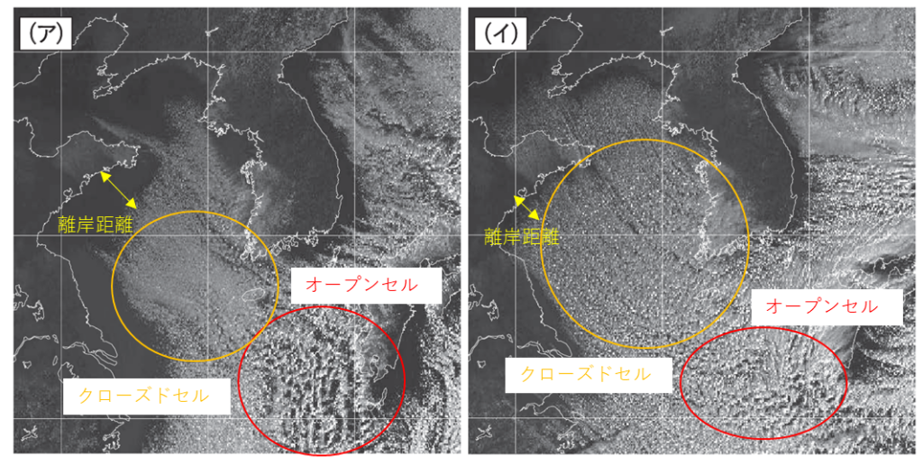 冬型の気圧配置の際、大陸から吹き出した冷たい空気が日本海を進むと、蜂の巣のような網目状の雲になります。大きく分けて「オープンセル」と「クローズドセル」の2種類があり、それぞれ大気の状態やもたらす天気が異なります。冬型の気圧配置で大気が不安定なのは下層のみなのでこれらの雲の雲頂高度は低く、赤外画像では灰色に見えます。