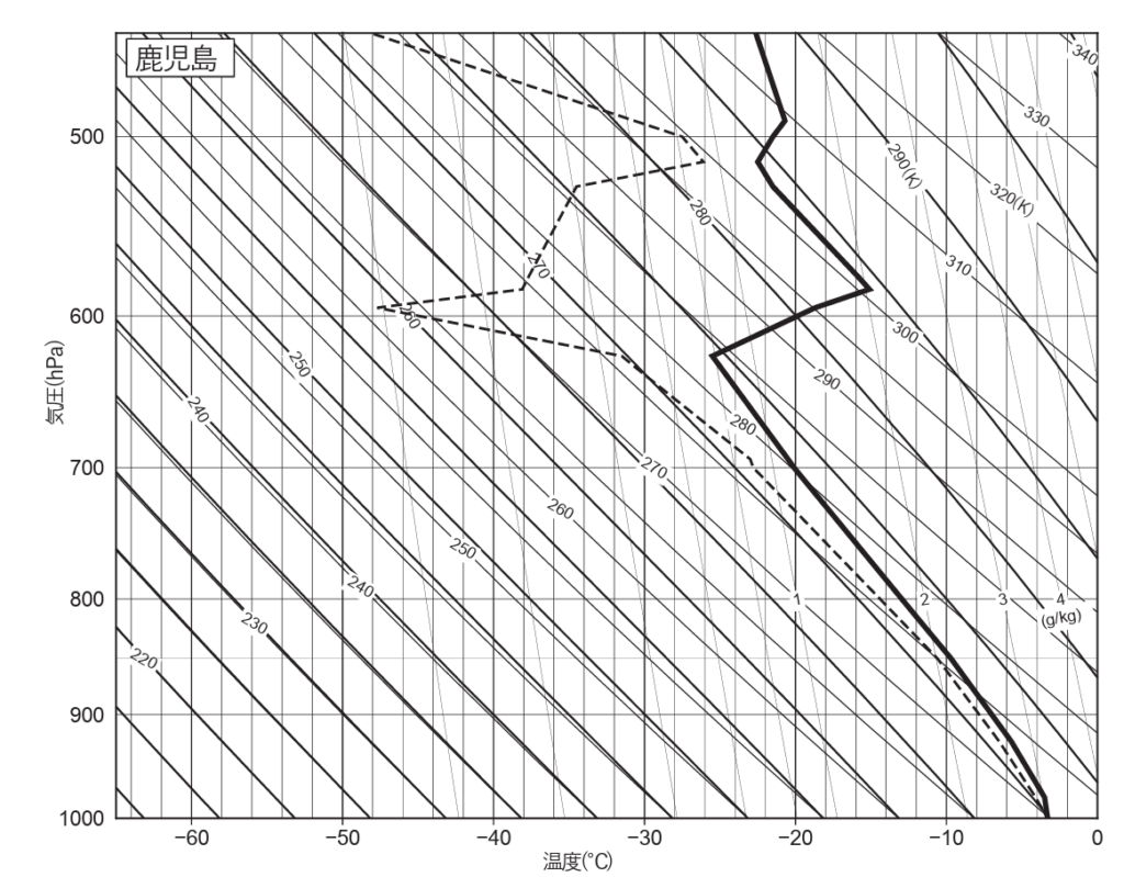 冬型の気圧配置における鉛直方向の空気の性質は、エマグラムで見ると非常に特徴的です。