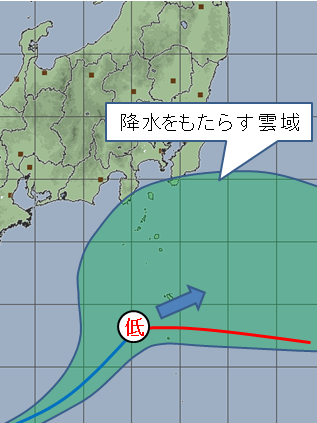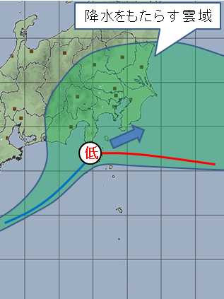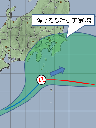 伊豆諸島の南部付近を通る場合: 寒気は引き込まれますが、低気圧の降水域(雲)が陸地まで届かず、「曇り」で終わることが多くなります。