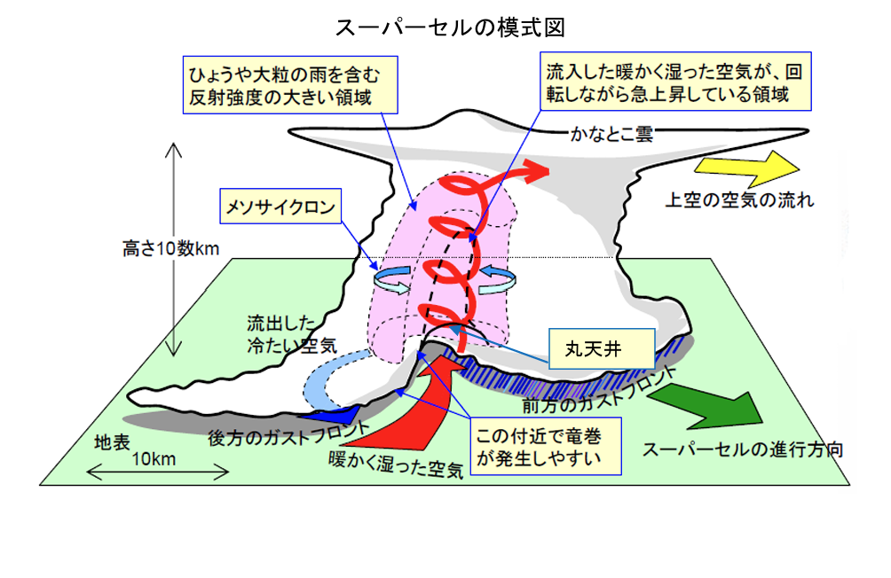 - スーパーセルは内部に回転するメソサイクロンを持ち、竜巻をもたらすことがある。