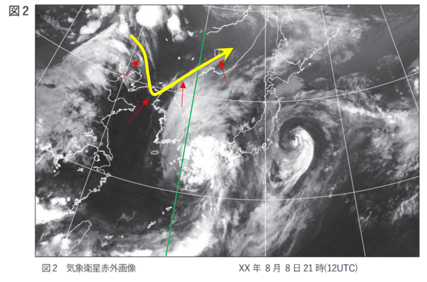 ②Ciストリークのすぐ北側に沿ったジェット気流は、朝鮮半島西岸付近で大きく南に張り出しています。トラフは、このようにジェット気流が南に凸となっている部分に解析されますので、朝鮮半島西岸付近が正解です。
