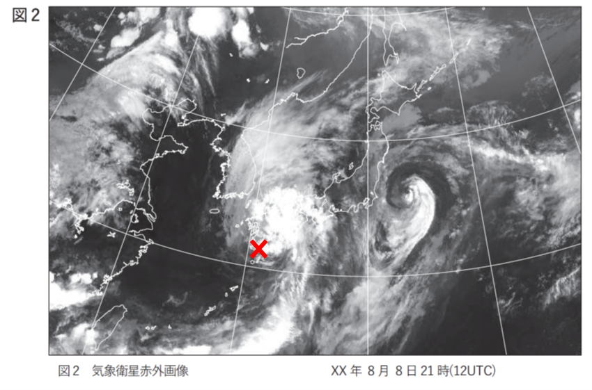 まずは、気象衛星画像での特徴です。下の図では気象衛星画像に、図1の台風中心位置を落とし込んでいます。