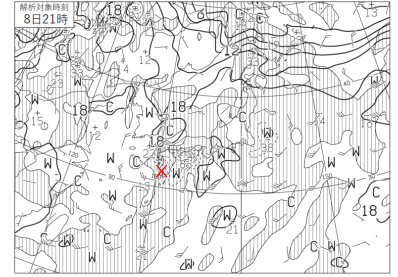 この台風のケースでも、衛星画像で明るく写っている発達した雲域は非対称に分布しており、主に中心の北から東側に分布しています。よって、