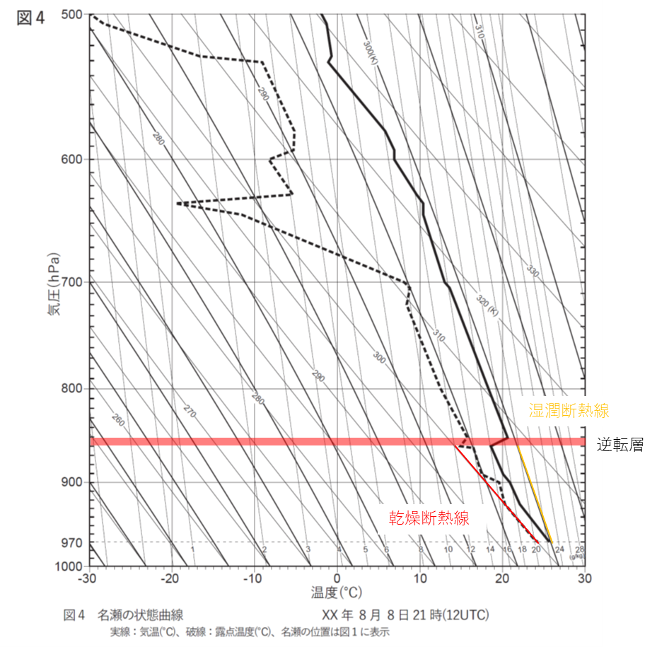 970hPaから逆転層の下端の860hPaの成層状態についてです。970hPaから860hPaにおいては、気温のグラフの傾きは湿潤断熱線よりも寝ていて、乾燥断熱線よりも立っています。これは大気の気温減率が、湿潤断熱減率よりも大きく、乾燥断熱減率よりも小さいことを示しています。