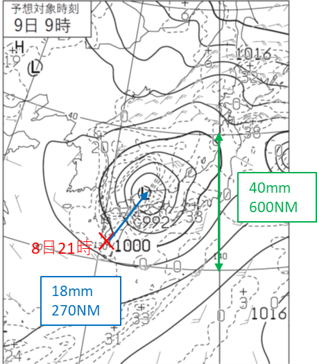 移動の速さについては、地図上で18mmの移動です。北緯30°から40°の600海里の地図上の距離が40mmなので、実際の移動距離は、600海里×18mm/40mm=270海里となります。