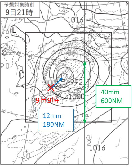 移動の速さは、地図上で12mmなので、600海里×12mm/40mm=180海里となります。