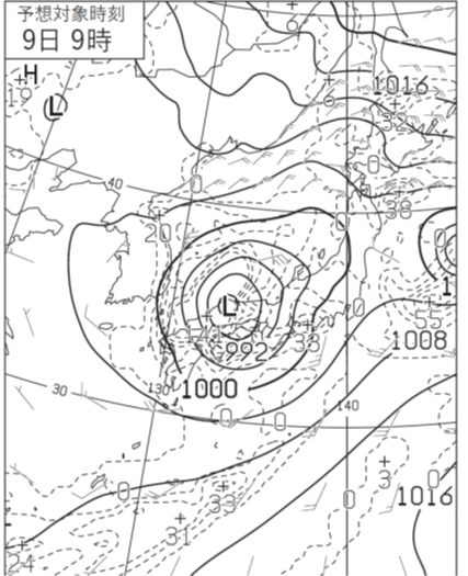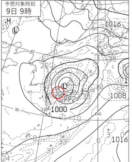 9日9時の前12時間降水量の最大は山口県の北部あたりに141mmと予想されています。これは前12時間の降水量であり9日9時の降水強度を示しているものではありません。この山口県の北部あたりの地点は、9日9時よりも前の時間に降水強度が強かったのだと推測できます。(1)で台風が北北東に移動していることがわかりましたので、9日9時には降水強度の強い部分もすこし北北東に移動しているものと考えられます。よって、選択肢のなかでは山陰沖が適しています。