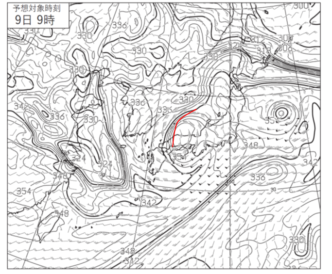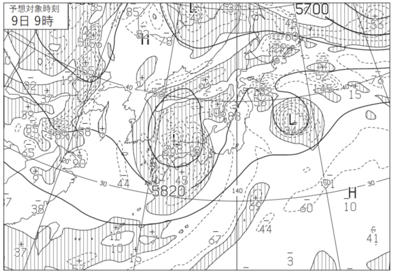 確かに500hPaの予想図には山陰沖に低気圧があり、寒冷渦の影響があるように思えます。寒冷渦は上層のに寒気が流入し、大気の上層で低圧となるものの、地表付近では低気圧は不明瞭になるものです。この低気圧は台風の影響そのものであり、寒冷渦によって大気が不安定になっているわけではないので、不適当です。