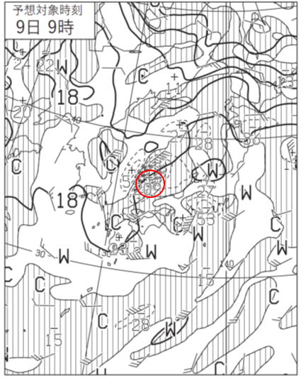 ①9日9時の時点で降水強度が最も強い地点を推測します。