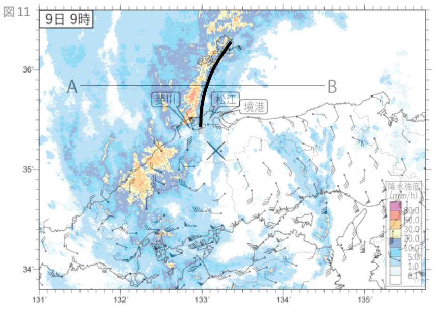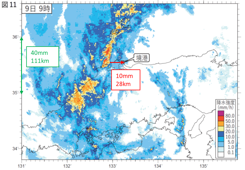 9日9時のエコーの20mm以上の領域と境港との地図上の距離は10mmです。緯度1°分の111kmが40mmで表されているので、強雨域と境港の実際の距離は、111km×10mm/40mm=28kmとなります。シアーラインとエコーは位置関係を変えないので、エコーの移動の速さを、シアーラインの移動の速さとすると、③より、11km/hとなりますので、強雨域が境港に達するまでにかかる時間は、
